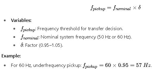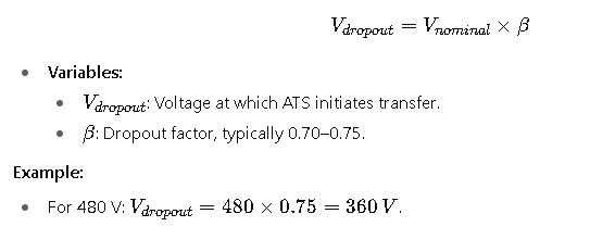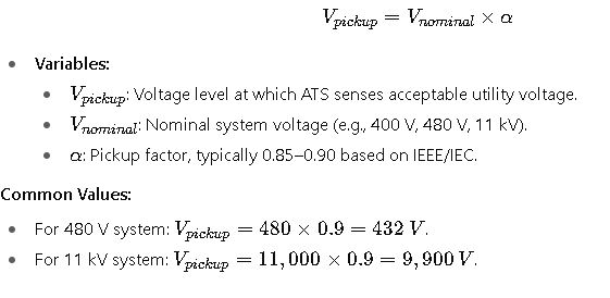 To properly configure an ATS, engineers must apply standardized formulas to compute pickup, dropout, and timing thresholds. Below are the most relevant formulas along with detailed explanations of each variable.