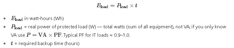 Fundamental formulas for UPS battery calculation (complete set) — derivations & variable explanations