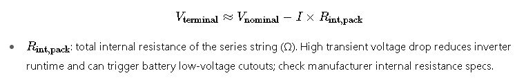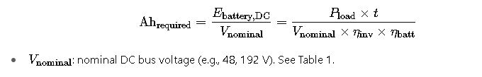 - Parallel strings required = ceil(238.37 / 100) = 3 strings in parallel → total battery bank = 4 (series) × 3 (parallel) = 12 × 12 V, 100 Ah blocks (effective nominal capacity 300 Ah). This yields margin and better handle Peukert and temperature.
