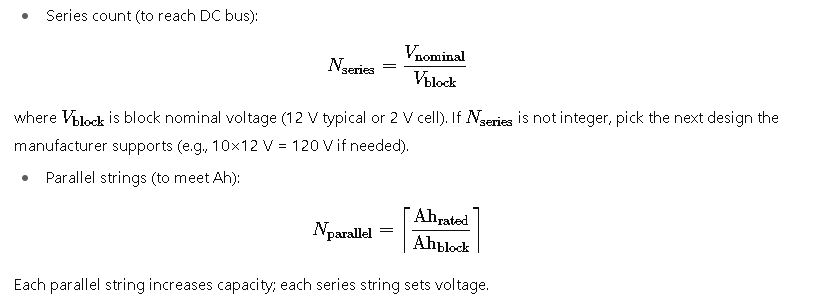 - Series = 48 V / 12 V = 4 blocks in series. Each string capacity = block Ah (100 Ah).