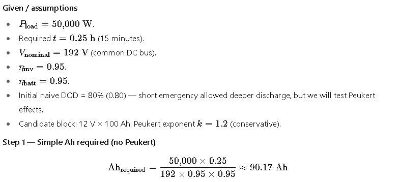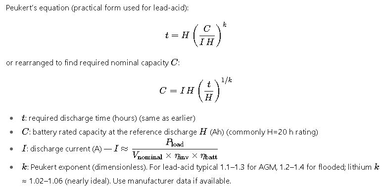 Why Peukert matters: at high discharge currents the effective Ah capacity can be significantly lower than the rated 20-h capacity — so for short but very large load events you must size for Peukert, not the simple Ah formula.