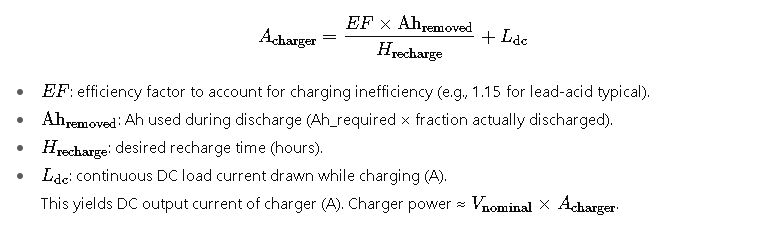 - Size charger for targeted recharge time and any continuous DC loads (formula provided earlier).