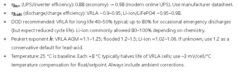 - DOD: fraction of the battery you allow to use (0.5 for 50% DOD, 0.8 for 80%). For long life, VRLA lead-acid often sized for 40–50% usable DOD; telecom/short emergency runs sometimes allow 80% for heavy events. See manufacturer guidance and standards.