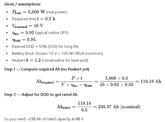 Case A — Small site: A 5 kW server rack needs 30 minutes (0.5 h) of UPS back-up (48 VDC battery string)
