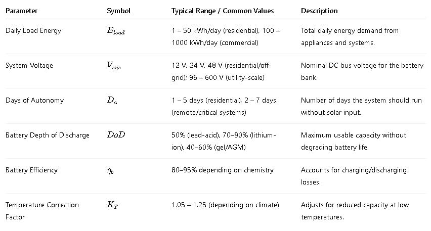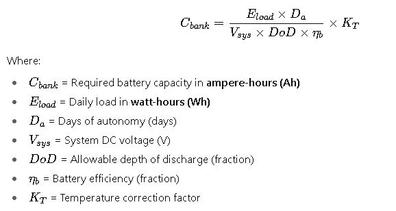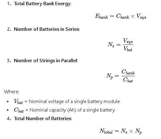 These formulas ensure that the designed battery bank matches the electrical requirements of the PV system.