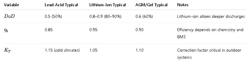 Total stored energy needed (Wh) = Net usable energy / (DoD × Temperature_derate × System_efficiency).