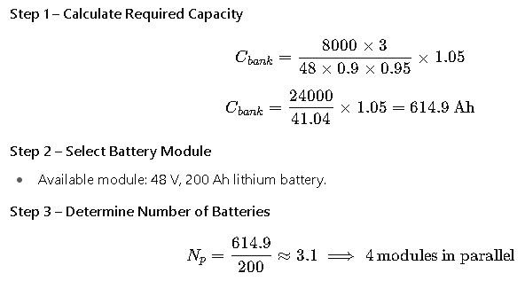 Small off-grid cabin | 3 kWh | 2 | Lead-acid AGM | 24 V | 8–10 kWh |