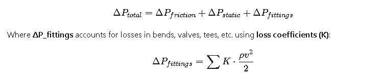 - Fitting losses add an extra 10–15% to the total pressure drop.