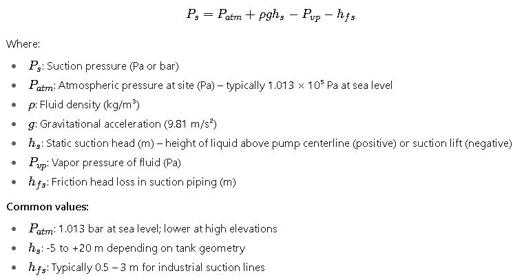 To accurately calculate suction and discharge pressure, engineers must evaluate several interdependent variables. Below are the most important parameters, explained in detail with typical ranges and industrial relevance.