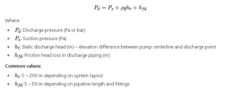- Discharge Pressure (Pd): The pressure at the pump outlet, dependent on static head, system resistance, elevation, and downstream equipment requirements.