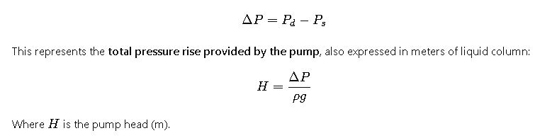 - Total Differential Pressure (ΔP): The difference between discharge and suction pressure, equivalent to the pump’s developed head.