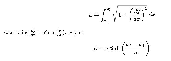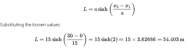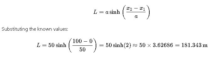 The parameter aaa is determined by the horizontal distance between the supports and the length of the cable. For practical applications, it’s often necessary to calculate the length of the cable between two points. The arc length L of the catenary from x1 to x2 is given by: