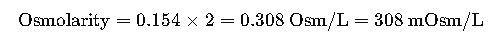 Sodium chloride | NaCl | 2 | 0.154 M (0.9% saline) | 308 mOsm/L |