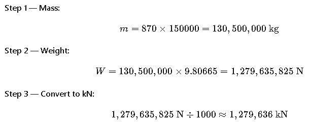 Scenario: A cargo ship is designed to carry 150,000 m³ of crude oil. We need to know the weight of the load in kilonewtons (kN) when density is 870 kg/m³.