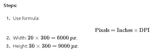 A designer prepares a poster measuring 20 × 30 inches for offset printing at 300 DPI.