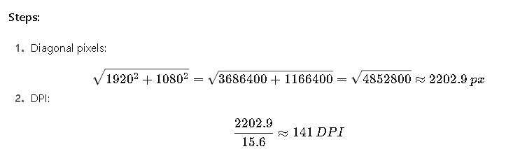 The laptop has 141 DPI, higher than the 96-DPI baseline. This explains why text may appear smaller at default scaling, requiring OS scaling adjustments (e.g., 125% in Windows).