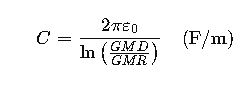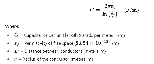 Capacitance: C = (πε₀) / ln(D/r) F/m