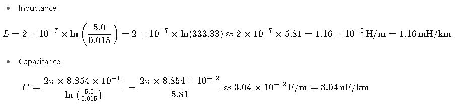 | Conductor Radius (m) | Conductor Spacing (m) | Inductance (mH/km) | Capacitance (nF/km) | Reference Standard |