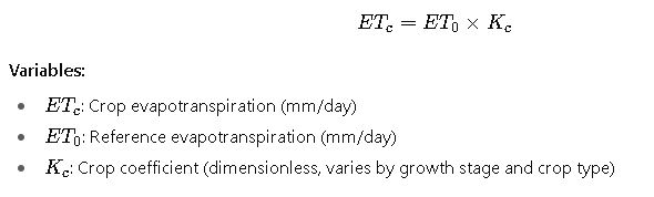 The irrigation requirement depends on the crop evapotranspiration (ETc), effective rainfall, soil properties, and irrigation system efficiency. The following formulas are used in practice across FAO56 guidelines, USDA Soil Conservation Service methods, and modern precision agriculture standards.