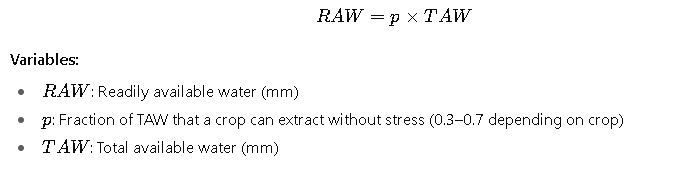- Soil parameters (FC, WP, TAW, RAW) determine how long crops can sustain without irrigation.