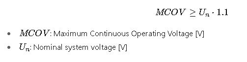 The maximum continuous operating voltage (MCOV) of an SPD must be greater than the system’s nominal RMS voltage: