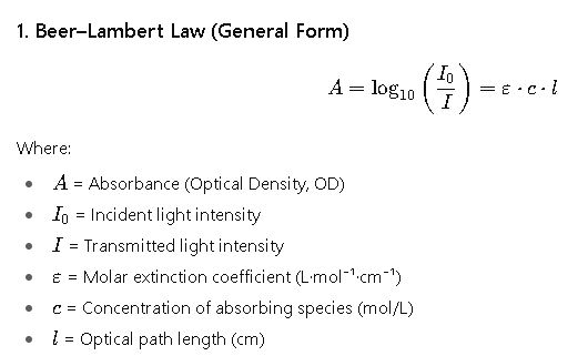 Optical density is a measure of how much a sample absorbs or scatters light. The calculation is rooted in the Beer–Lambert Law, but adapted for microbial suspensions where scattering dominates.