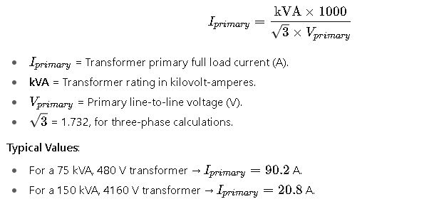 - Typically, a fused primary switch rated at 100 A or protective relays with current transformers (CTs) are used.