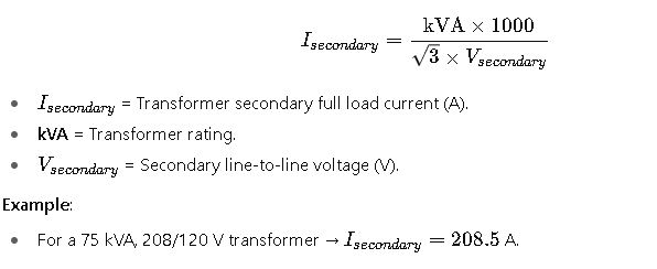 Transformer kVA | Secondary Voltage (V) | Secondary Full Load Current (FLA) | Max Secondary Protection (% of FLA) | Max OCPD Size (A, Rounded to Standard) |