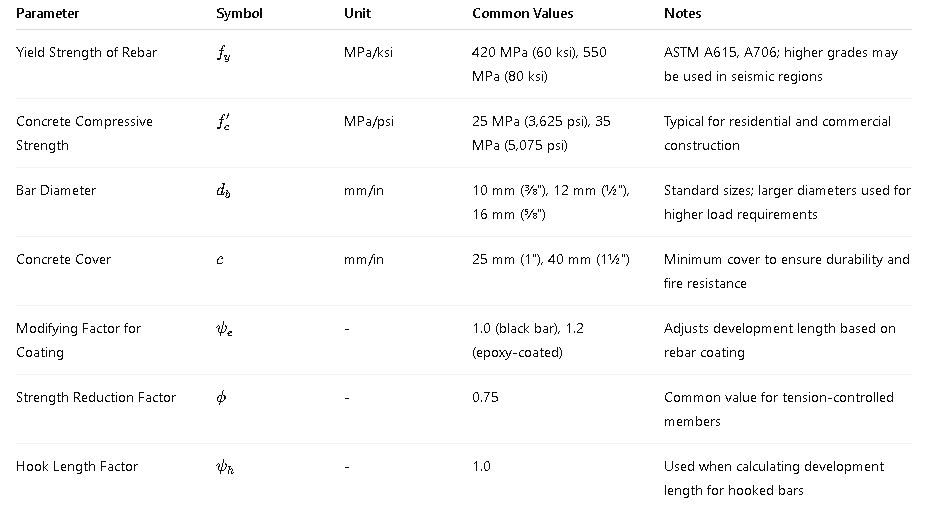 Understanding the typical values used in rebar calculations is essential for accurate design. Below is a table summarizing the most common values for various parameters: