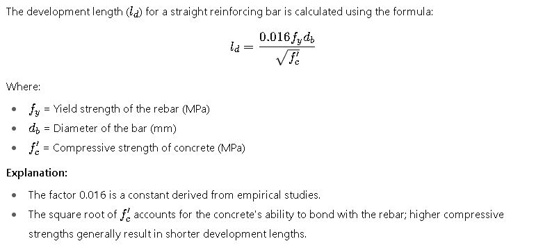 - Concrete Strength: Higher compressive strengths lead to shorter development lengths.