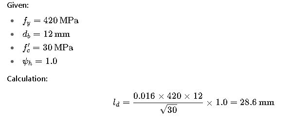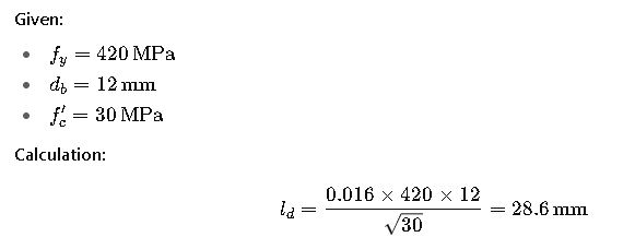 - The required development length for the bar is 28.6 mm to ensure full bond strength.