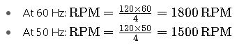 If a motor designed for 60 Hz operation is to be used in a region with a 50 Hz supply, the synchronous speed will change. For a 4-pole motor: