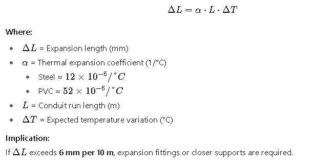 | Rigid PVC Conduit | 16–25 mm | 0.9 m | Short spacing due to thermal sag |