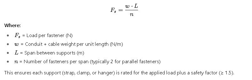 - Load rating of fasteners must always exceed conduit + cable weight, especially in industrial applications.