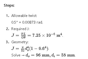 Transmit 5000 N·m with max twist ≤ 0.5°/m. Steel (G = 79 GPa), di/do = 0.6.