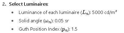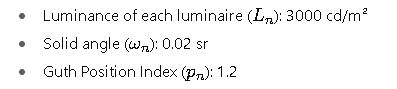 - Luminance of Each Light Source (Ln): The brightness of each luminaire visible to the observer. Higher luminance values increase the likelihood of discomfort glare.