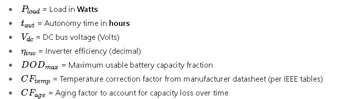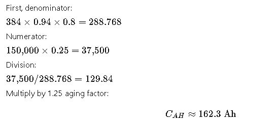 The standard approach to calculate required battery capacity (C_AH) in ampere-hours: