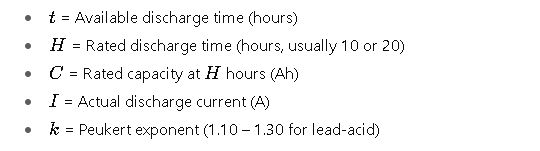 1. Peukert’s Law (High-Rate Discharge Adjustment)