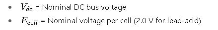 - Series: Divide the DC bus voltage by nominal cell voltage (2.0 V for lead-acid).
