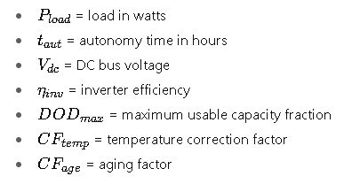 Assumes VRLA battery, η_inv = 0.94, DOD_max = 0.8, CF_age = 1.25, CF_temp = 1.00.