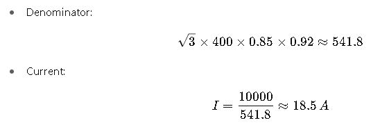 An industrial facility operates a 10 kW three-phase induction motor at 400 V AC, 50 Hz, with a power factor of 0.85 and an efficiency of 92%. The engineer must calculate the line current.