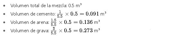 El cálculo de las proporciones para la mezcla de concreto se basa en la relación volumétrica entre los componentes principales: cemento, arena, grava y agua. Las fórmulas fundamentales son las siguientes: