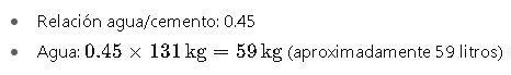 La cantidad de agua (W) se determina según la relación agua/cemento (a/c), que influye directamente en la resistencia y trabajabilidad del concreto: